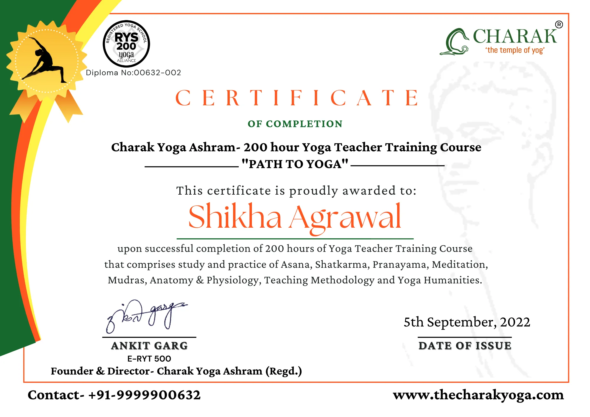 To spread the teachings of classical yoga integrated with solutions for modern-day physical and mental stress, Yogacharya Ankit Garg who is yoga Hat & Raj practitioner (certified from Dev Sanskriti. Haridwar, Shanti Kunj, and Vishwavidyalaya) and holds an MA in Applied Psychology and a P.G. certification in Yogic Science built the foundation Of Charak Yoga Ashram, the temple of Yog, offering yoga teacher certification courses.